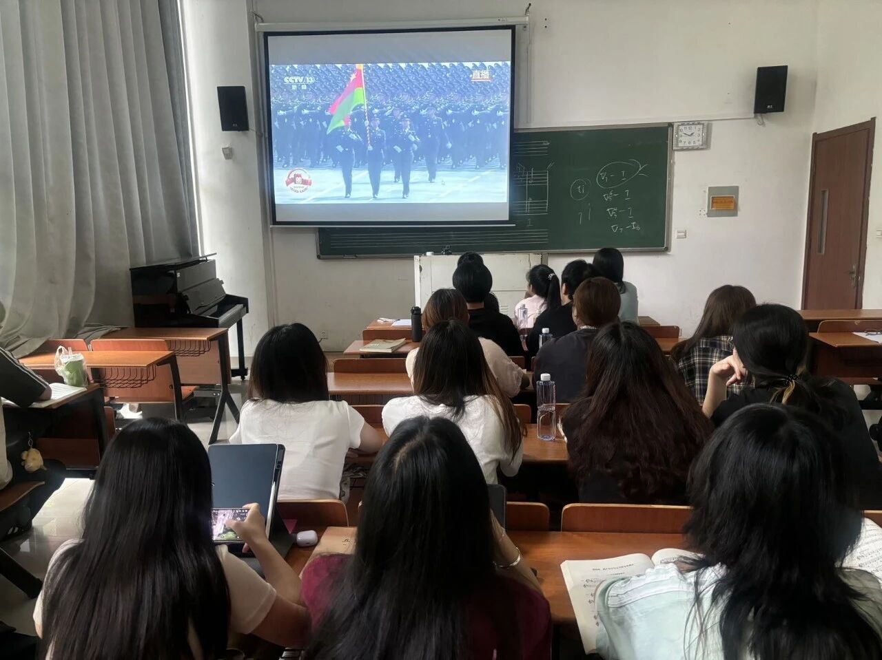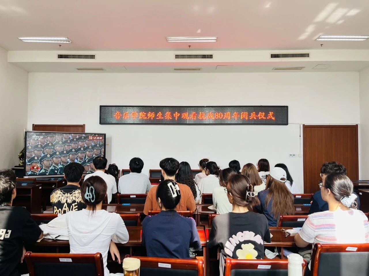 师生们早早抵达会议室和教室,实时感受这场展现国威、振奋人心的国家盛典。在合唱教室,音乐学院院长、关工委主任仲崇连老师、关工委常务副主任张律教授与青年师生一同观看,齐唱国歌,观看现场气氛庄重而热烈。伴随着屏幕上铿锵有力的步伐和威武雄壮的阵列,与会人员全神贯注,心情澎湃。一幕幕盛大场面、一件件大国重器,充分展现了我们国家强大的国防力量和现代化建设的辉煌成就,激发了每一位在场人员深深的民族自豪感和爱国热情。宿舍区,同学们自发围坐收看,并用手机拍摄分享精彩瞬间,朋友圈刷屏“9·3阅兵”点赞祝福,形成线上线下共鸣。