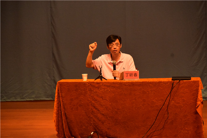 丁教授在一开始就抛砖引玉,向大家提出三个问题:“为什么上大学?上大学学什么?上大学怎样学?”他告诉大家:“大学是人全面发展的地方,我们要在文化中学习艺术,在艺术中体会文化并提出四点建议:一、守正笃实,久久为功;二、知行合一,学以致用;三、自尊而尊人,人恒尊之;四、志存高远,追求卓越。