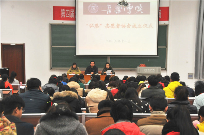 11月24日中午,音乐学院“弘恩”志愿者协会成立仪式在音乐楼A1-111举行,志愿者协会全体成员260人参加会议,会议由党委副书记殷成志主持。
