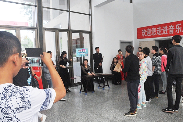 在乐之音协会、舞之韵协会和布谷鸟志愿者协会的精心安排下,富有专业特色的迎新队伍迎接着学弟学妹们。音乐学专业的学姐身着合唱长裙,舞蹈学专业的学姐则呈现平日整齐的练功班服,引导音乐学专业和舞蹈学专业的新同学去厅内办理手续。荣获全省大学生艺术展演一等奖的民乐团成员在几天前就已在报名点预先排练,今天,他们身着演出服,奏出各自的拿手曲目;舞蹈专业的学姐们摆出佳人造型,向学弟学妹们展示专业基本功,彰显出音乐学院别具一格的艺术氛围,吸引着新生和家长的目光。新生们惊叹地表示,这着实是给他们上了专业第一课。