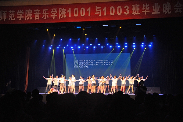 毕业,是一个沉重的动词;毕业,是一个让人一生难忘的名词;毕业,是感动时流泪的形容词;毕业,是当我们以后孤寂的时候,带着微笑和遗憾去回想时的副词;毕业,是我们夜半梦醒,触碰不到而无限感伤的虚词。若干年后,假如我们还能够想起那段时光,也许这不属于难忘,也不属于永远,而仅仅是一段记录成长经历的回忆。6月14日晚,淮阴师范学院音乐学院1001班和1003班主题毕业晚会在学校大礼堂浓情上演。晚会在全体同学活泼、生动的开场秀中拉开帷幕。现场师生首先共同欣赏毕业生们精心制作的毕业纪念相册,相册上那些如花的笑靥,记录他们最快乐的青春生活。时光永远定格在那一刻,定格在最美的青春岁月里。动感的开场舞蹈舞动着青春的脉搏,昭示着当代大学生朝气蓬勃,奋发向上的生活姿态。
