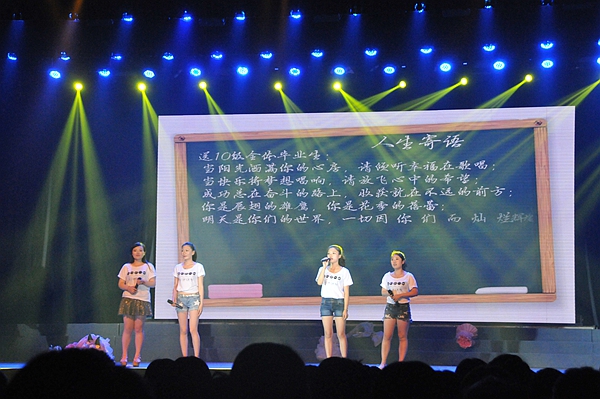 晚会以祝福为宗旨,1001班女生小合唱《老师我想你》唱出对母校深深的留恋和对老师的不舍之情,饱含对母校最真挚、热忱的祝福;《当》以欢快的曲调致即将逝去的青春岁月,感叹时光匆匆;1003班以《女子水鼓》作为开场,把气氛推到高潮;器乐合奏《烟花易冷》带我们领略了不一样的流行风采;舞台情景剧《大学四年》以大学四年里的每一个小片段表达出对同学、老师、青春的深深眷恋,感人肺腑的话语感动着现场的每一位观众,催人泪下。
