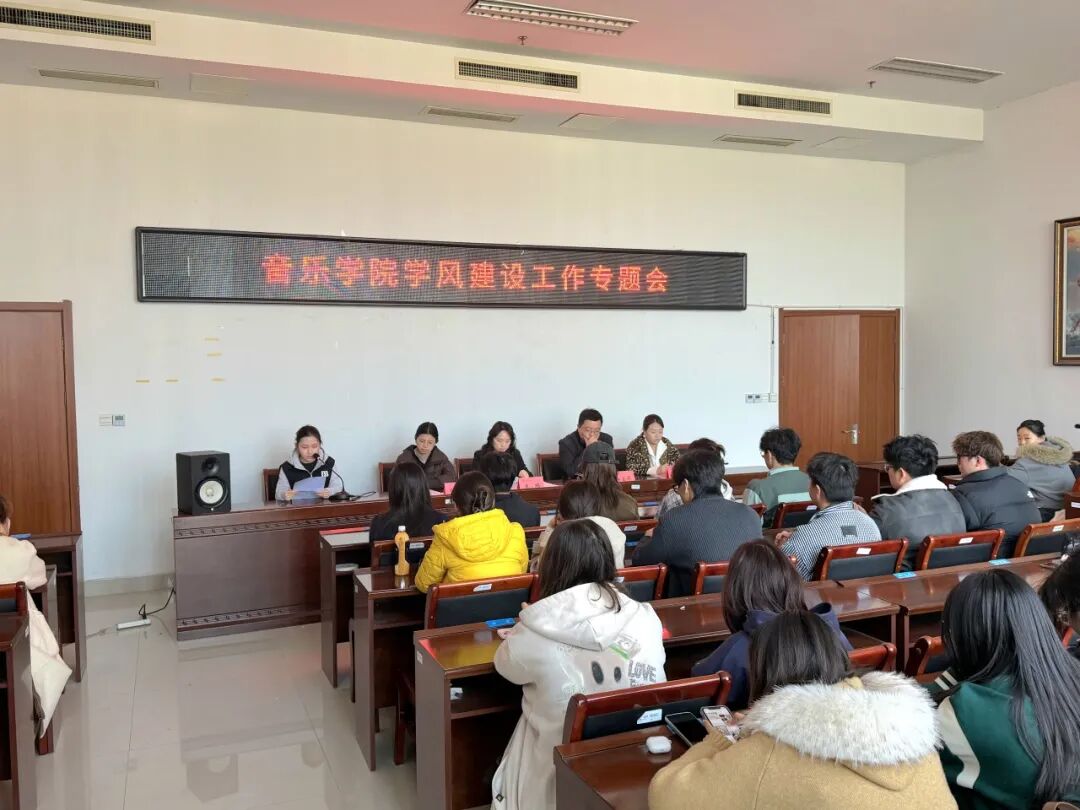 为持续加强学风建设,营造勤学善思、严谨笃学的育人氛围,3月25日下午,音乐学院召开2026年学风建设工作专题会。院党委副书记王玮、副院长徐言亭出席会议并讲话,班主任、辅导员、2025级班长及学生代表参加会议。